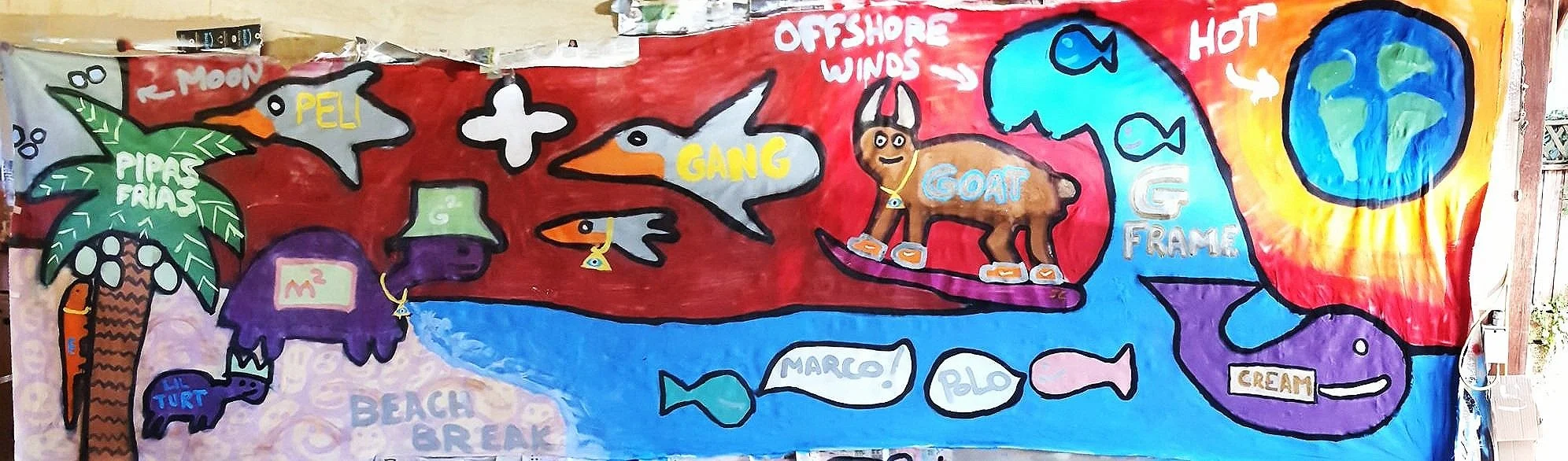 Santa Teresa Surf Trip - Spray paint graffiti on canvas 18x5.3 feet (5.5x1.6 meters)